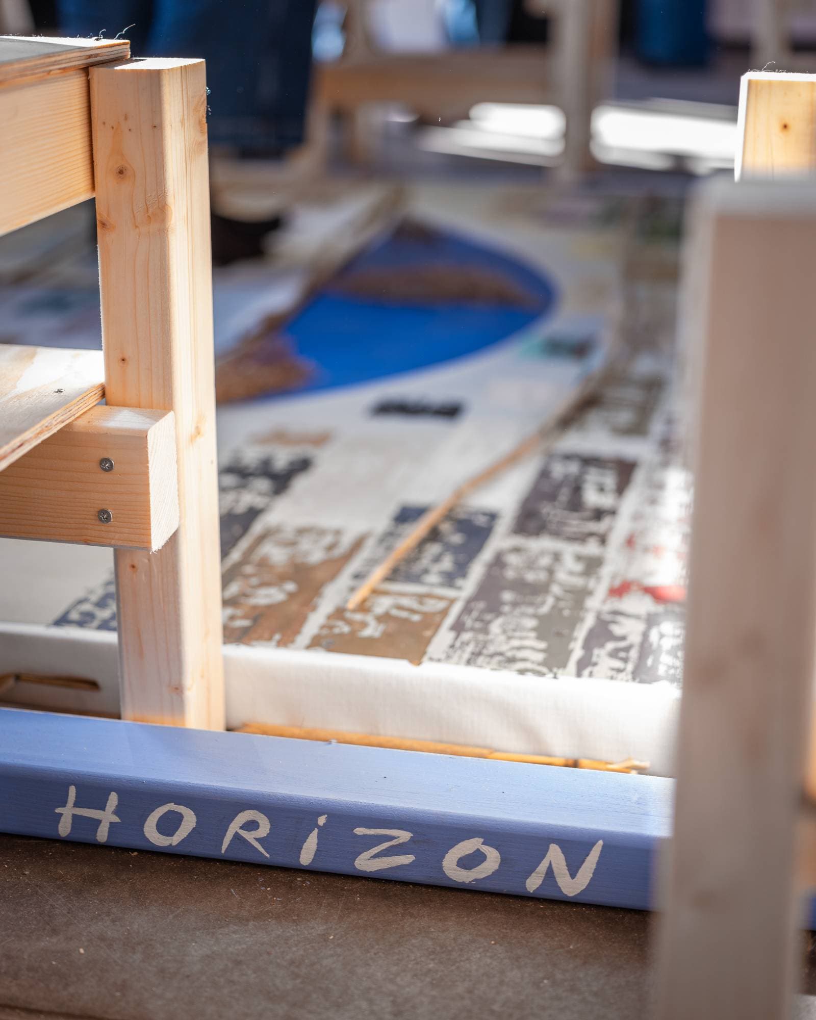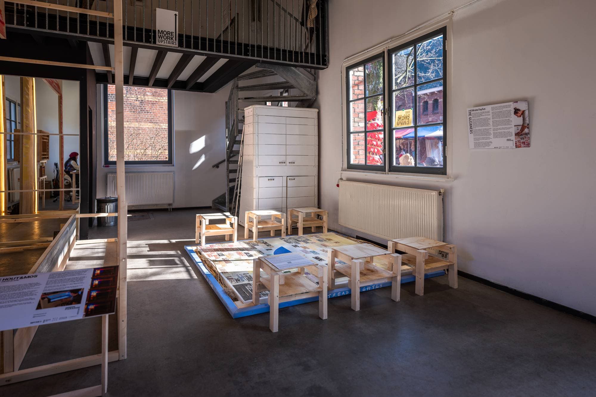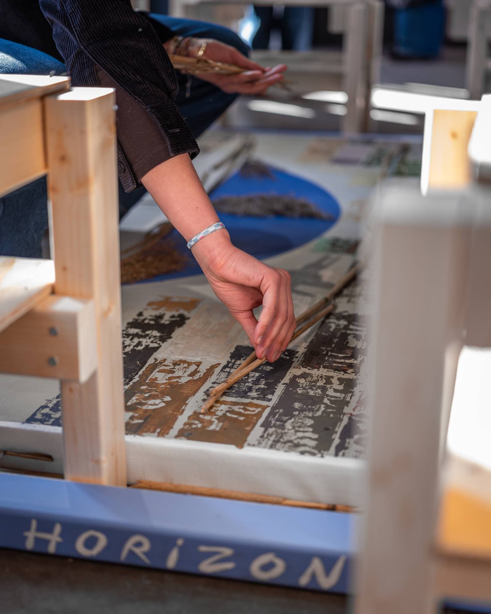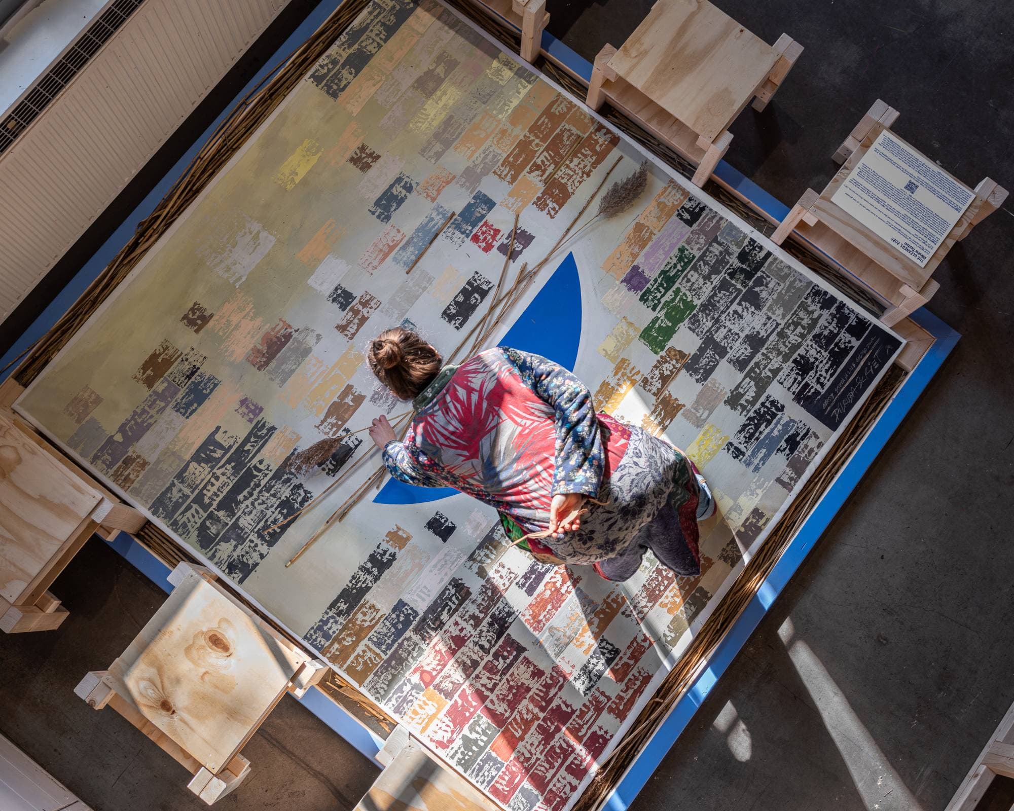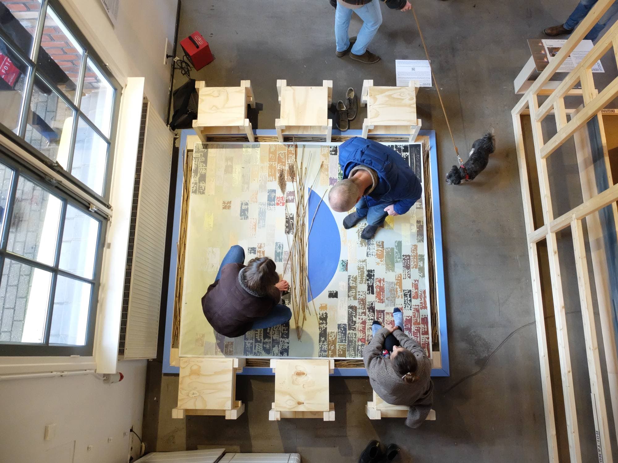 Custom wooden frame and benches set by Alexander Petrounine and Anna Underowicz.
