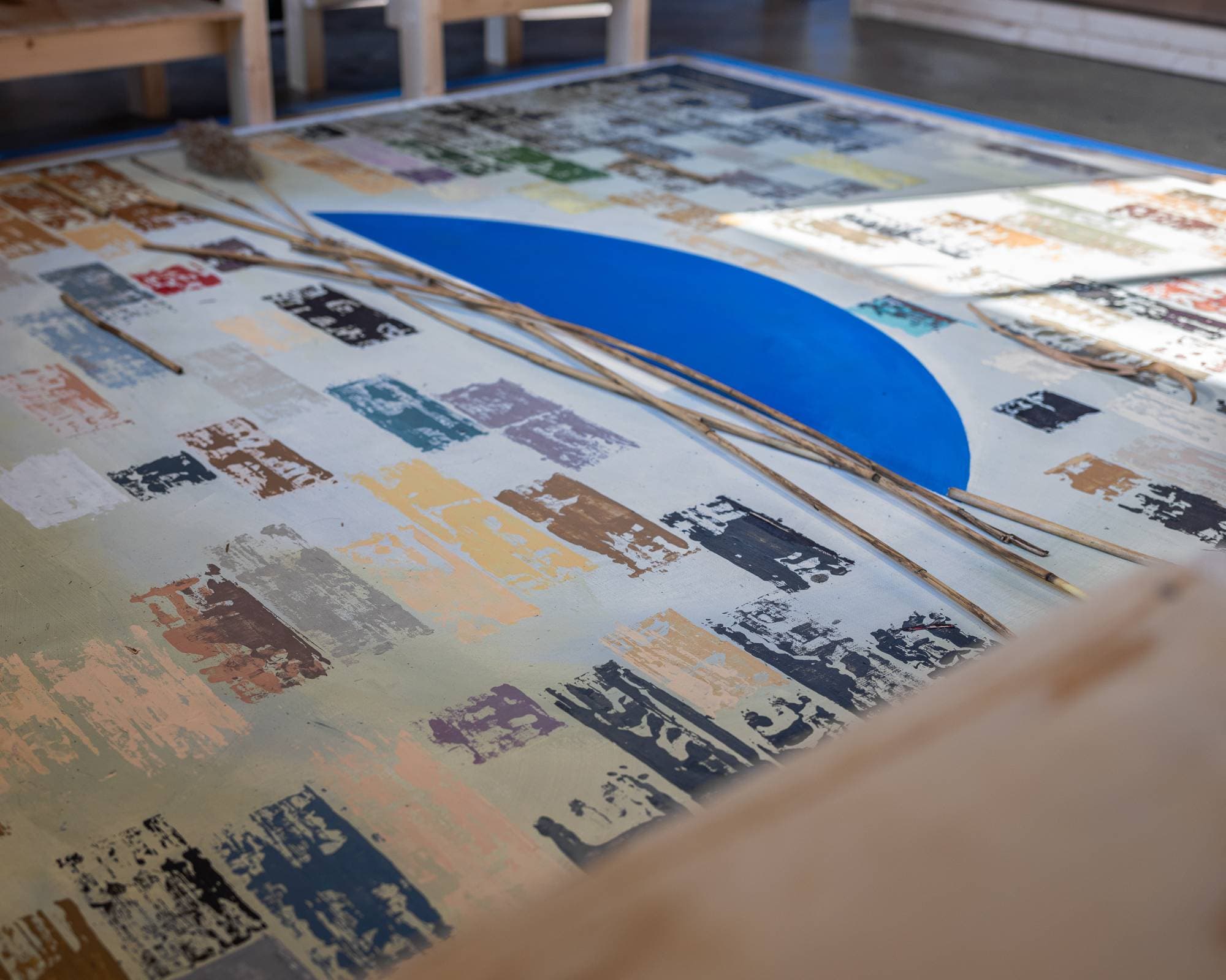Acrylic, foraged sea salt, charcoal and reed fiber on linen with custom wooden frame and benches set